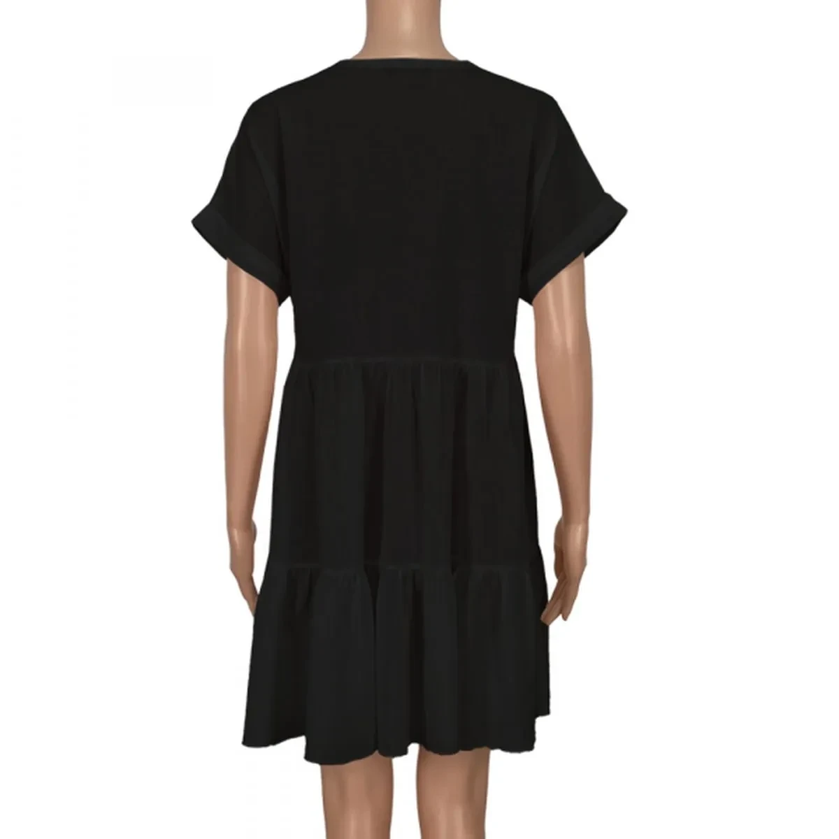 The Eva Dress combines comfort and elegance in a light, flowing silhouette. Its V-neckline and wide sleeves add a touch of freshness and movement, while the loose fit drapes naturally and gracefully.