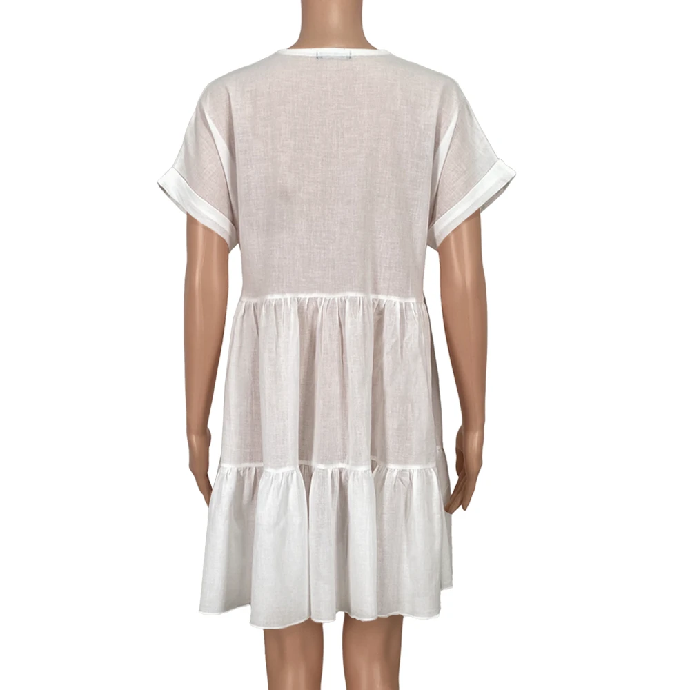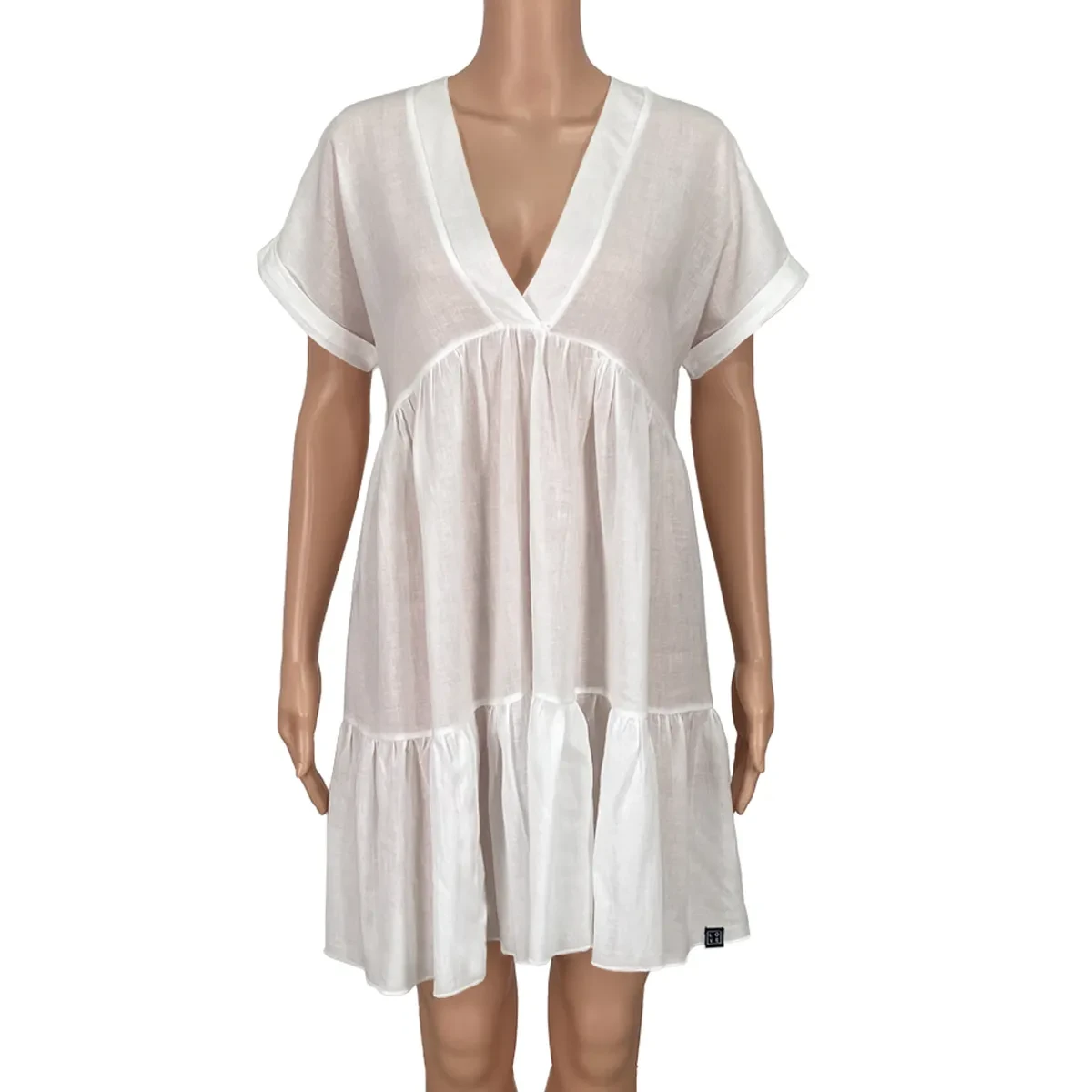 The Eva Dress combines comfort and elegance in a light, flowing silhouette. Its V-neckline and wide sleeves add a touch of freshness and movement, while the loose fit drapes naturally and gracefully.
