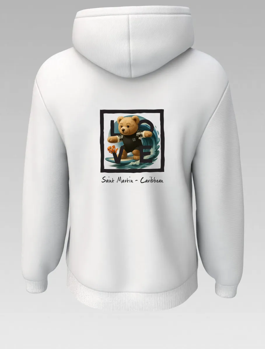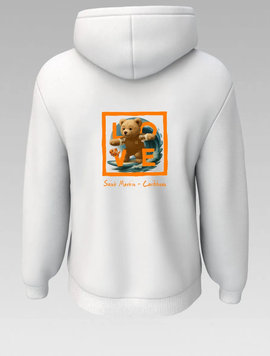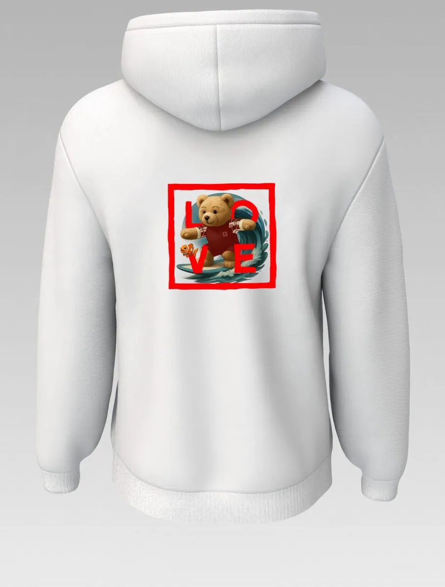 This white LOVE hoodie features the brand's iconic bear — a symbol of freedom, joy, surfing, and marine adventures. The design showcases the bear on a surfboard, with multiple color variations of the LOVE logo for extra fun and style.