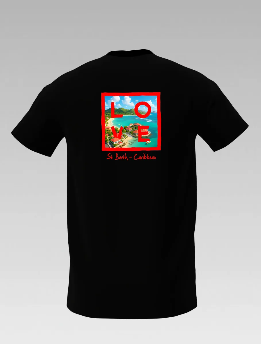 This black T-shirt from St Barth Signature, part of the LOVE Edition, reflects the calm of the sea and the timeless elegance of the Caribbean night.