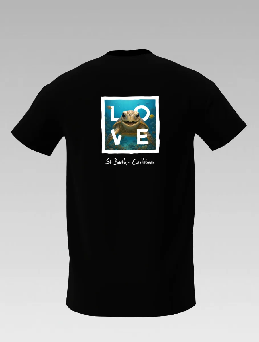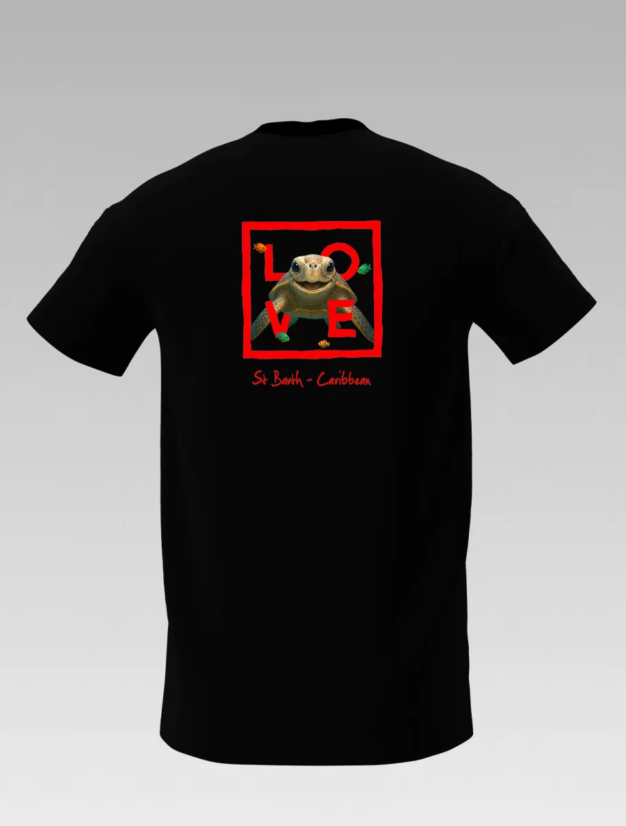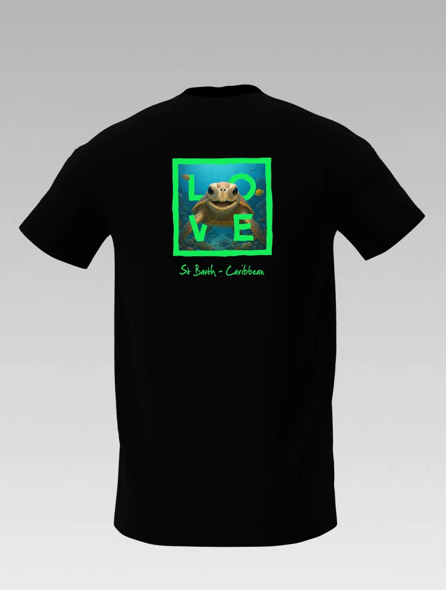 This black T-shirt from St Barth, part of the LOVE line, captures the sweetness and serenity of the ocean through a cheerful turtle swimming among corals and tropical colors.
