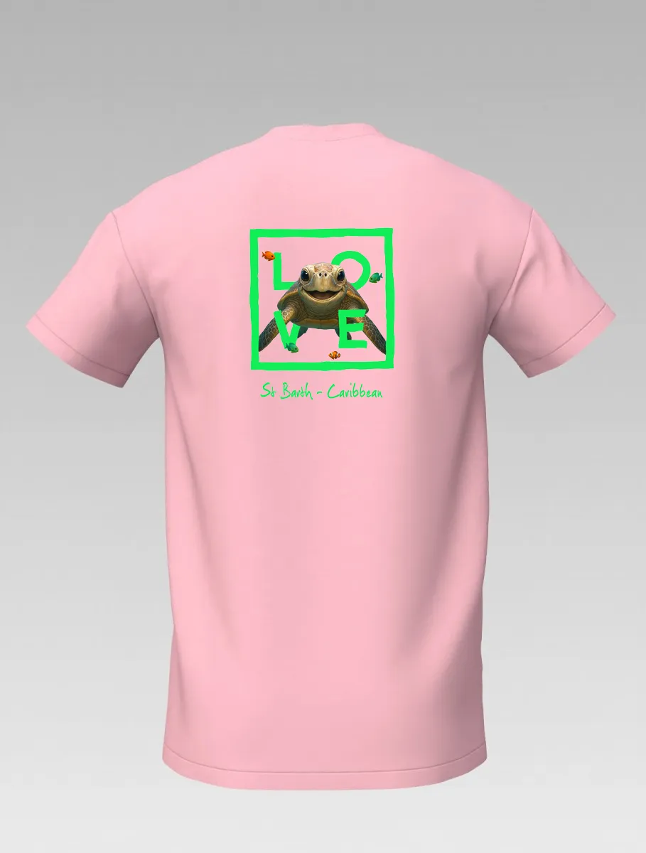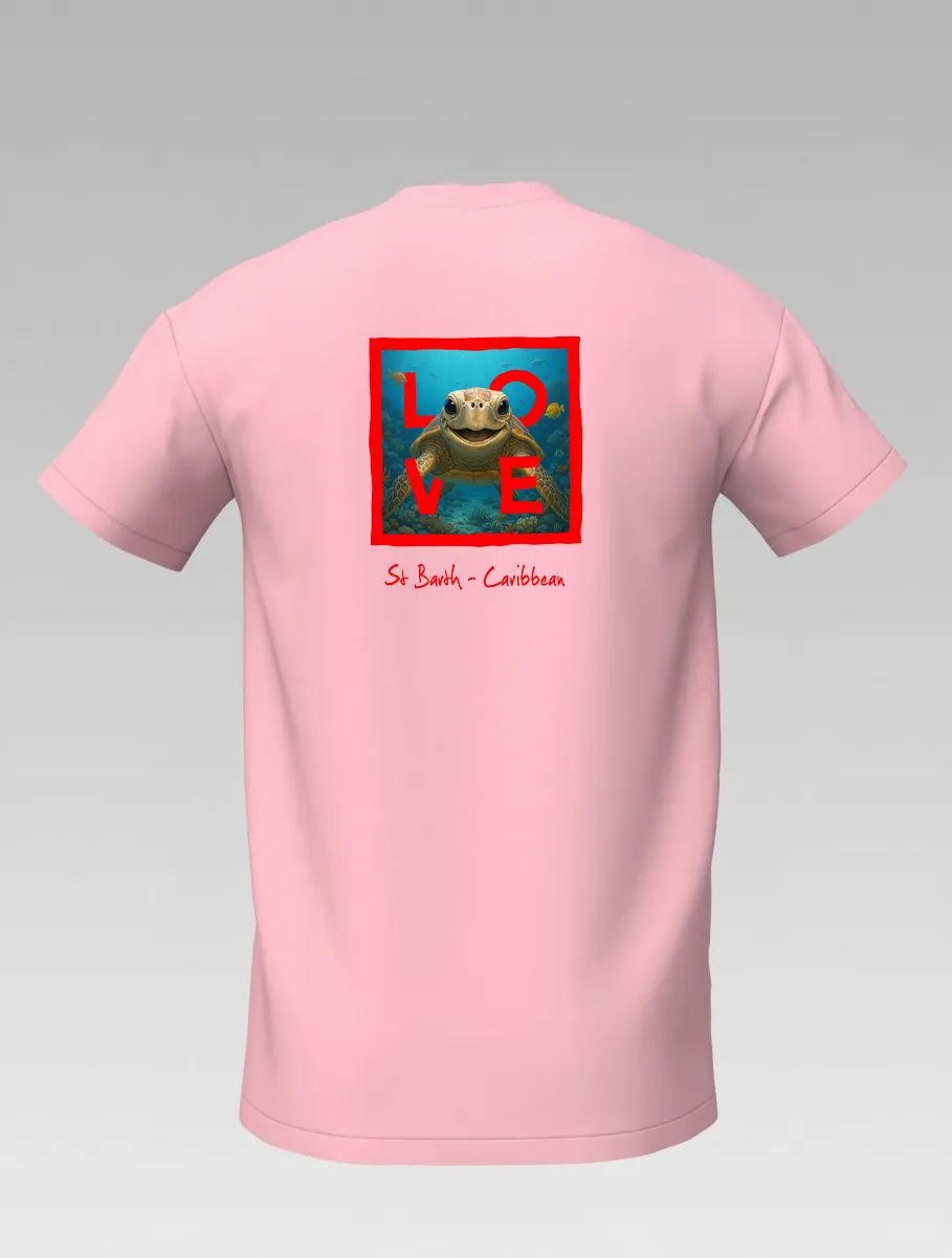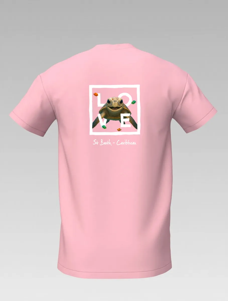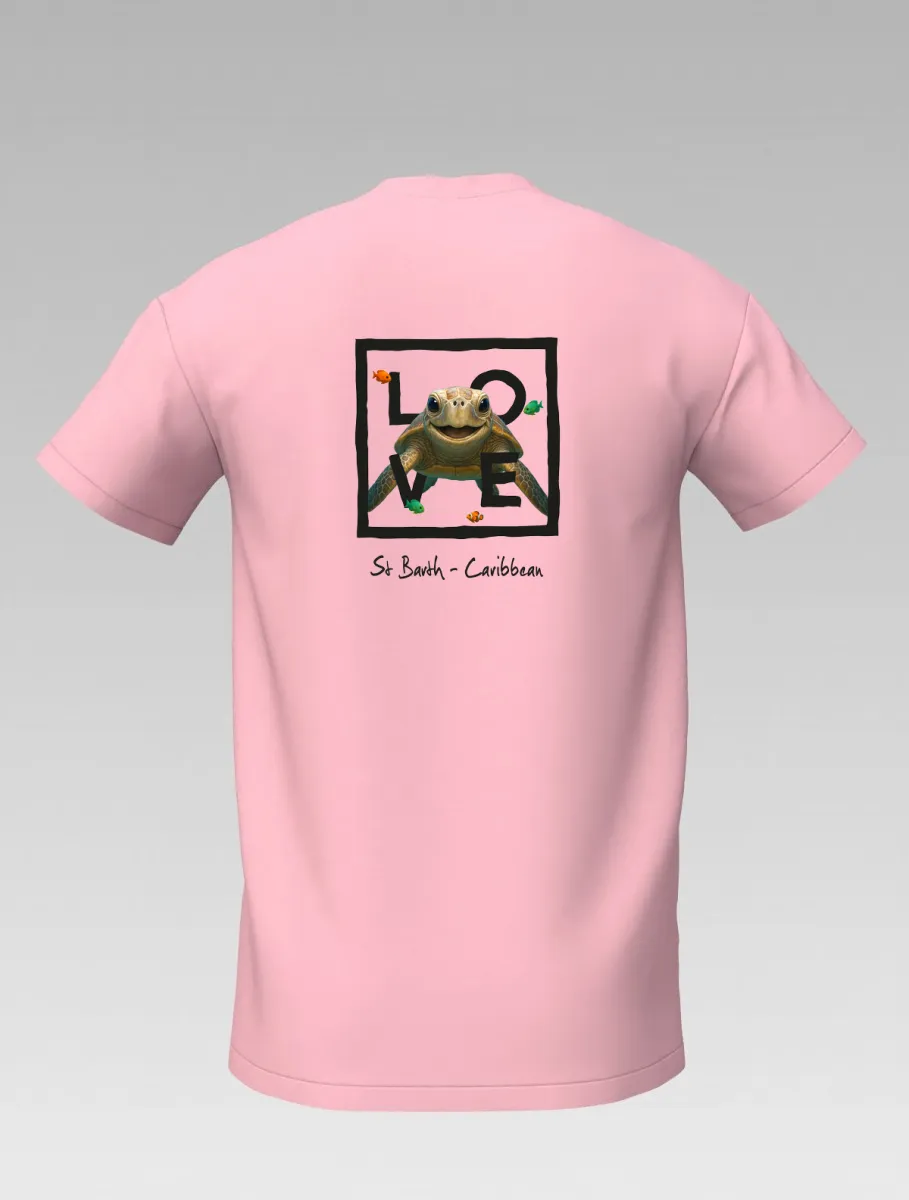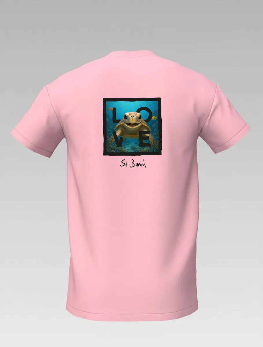 This pink T-shirt from St Barth, part of the LOVE line, captures the sweetness and serenity of the ocean through a cheerful turtle swimming among corals and tropical colors.