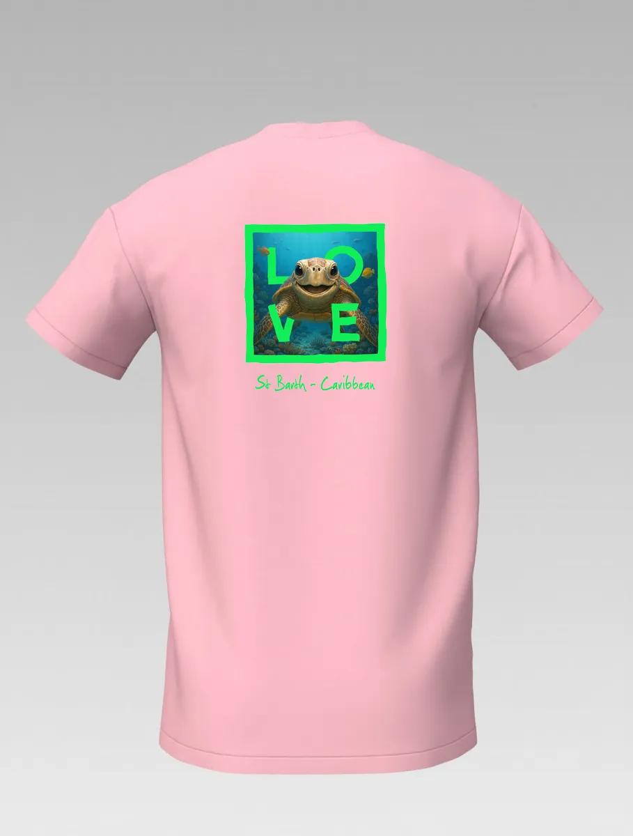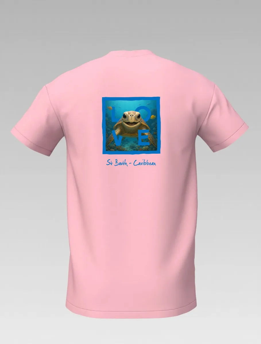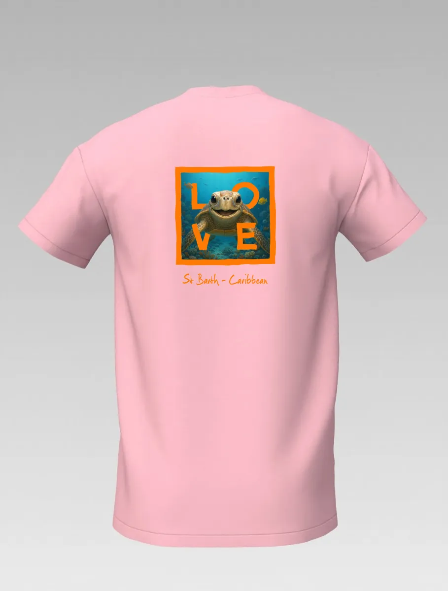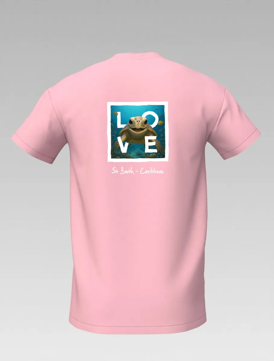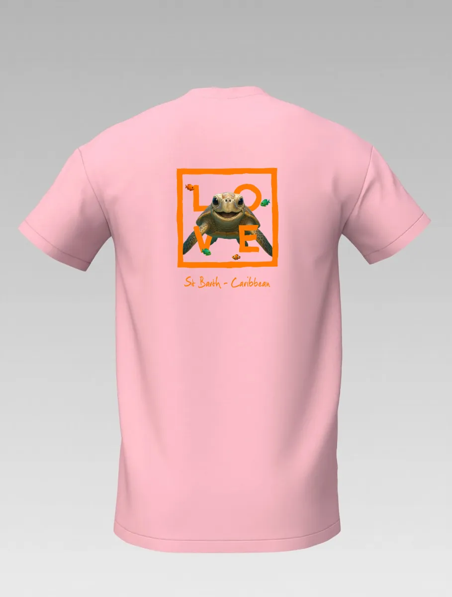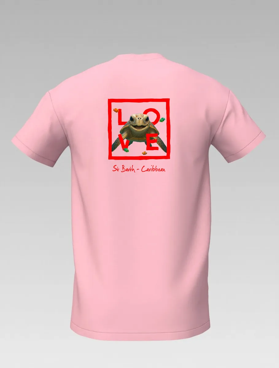 This pink T-shirt from St Barth, part of the LOVE line, captures the sweetness and serenity of the ocean through a cheerful turtle swimming among corals and tropical colors.