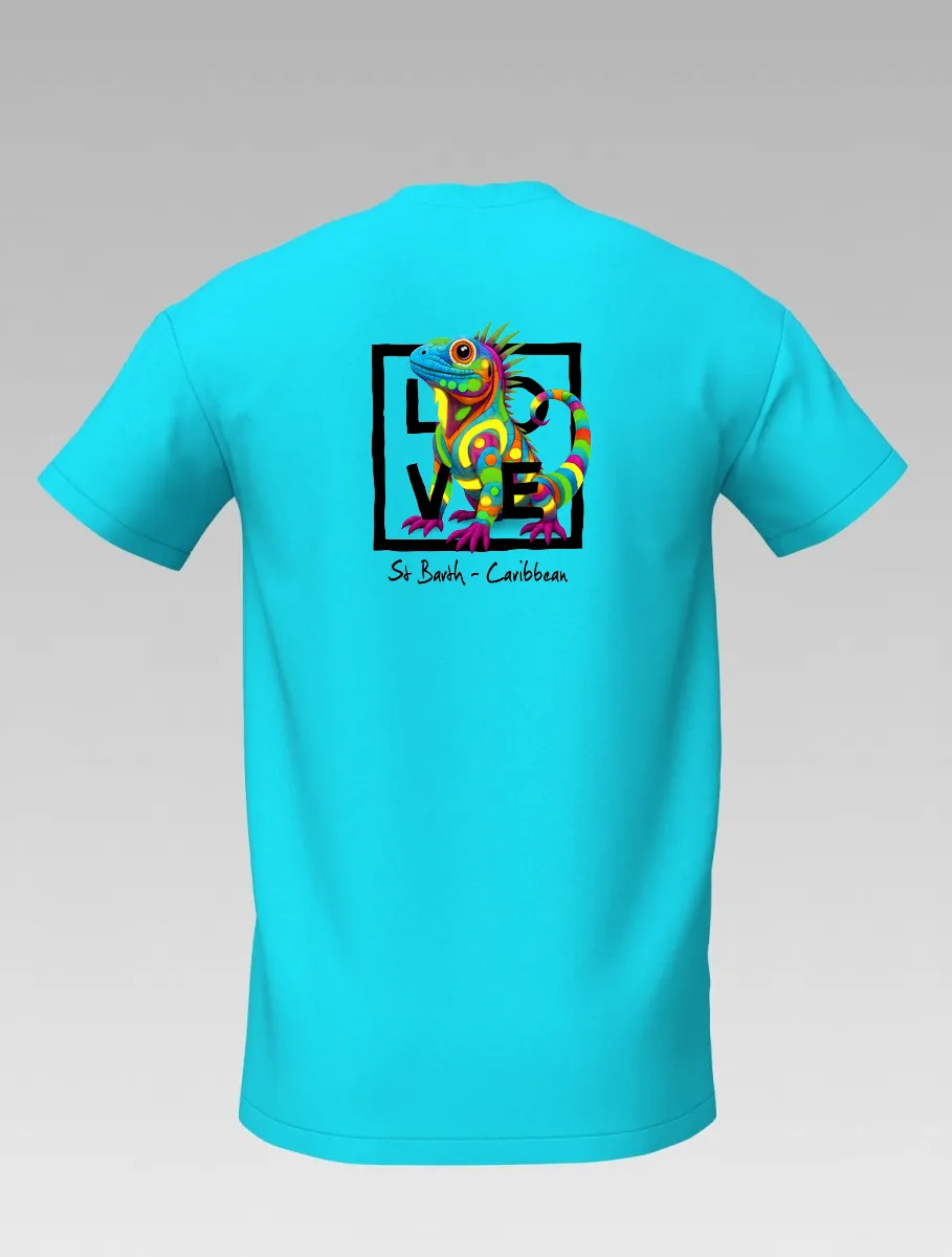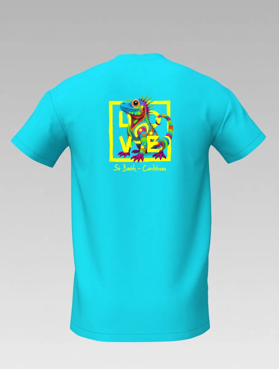 Kids’ turquoise T-shirt – Cotton and elastane – Iguana of St. Barth San Martin – LOVE Children’s Edition – A playful tribute to the island’s spirit in color, comfort, and tradition.