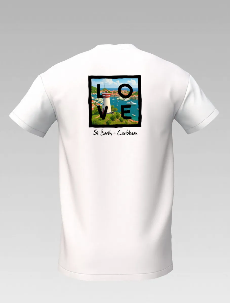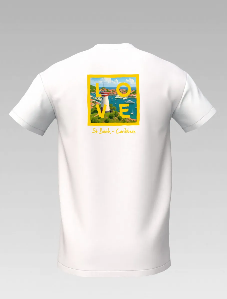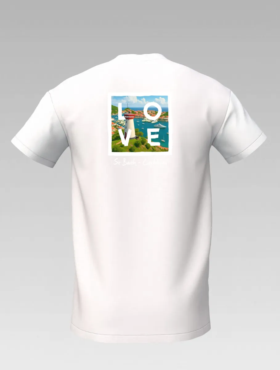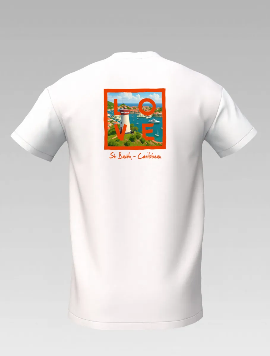 This white T-shirt from St Barth Signature, part of the LOVE Edition, celebrates the beauty of Gustavia Harbor, where boats rest on crystal-clear waters and colorful houses light up the horizon.