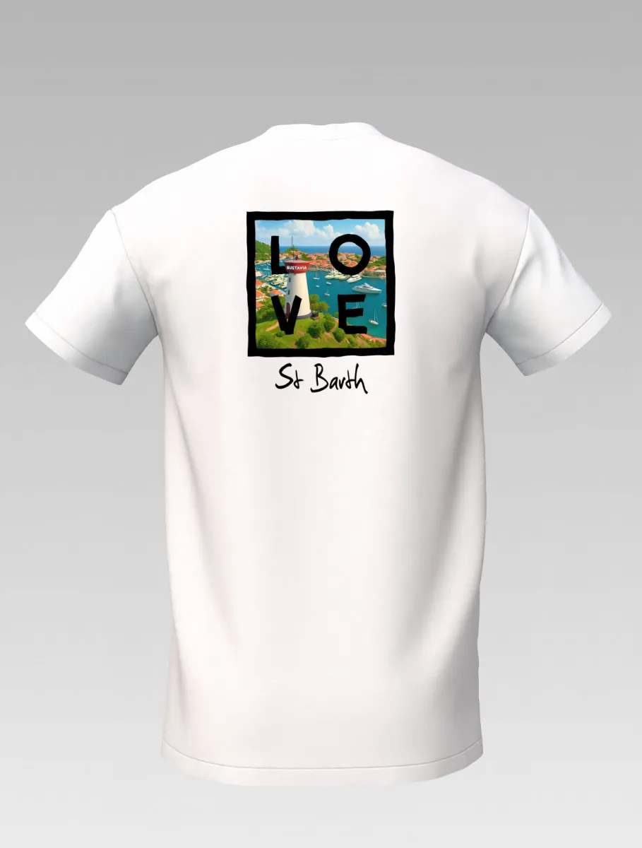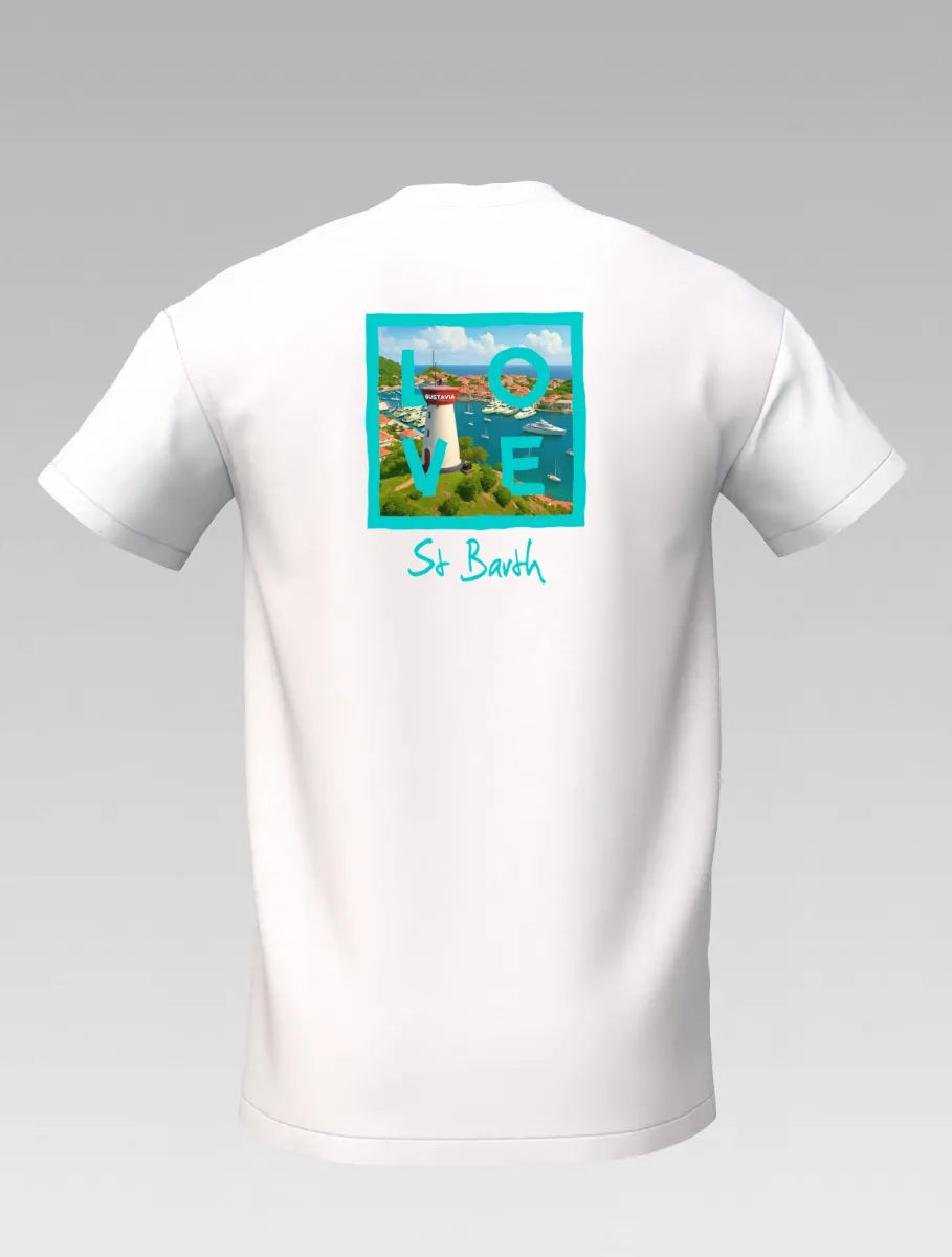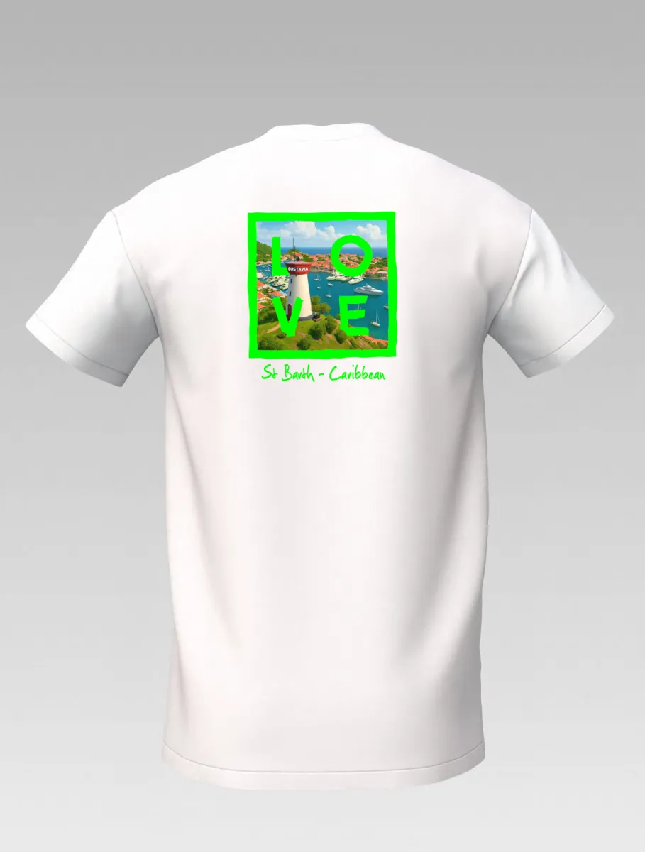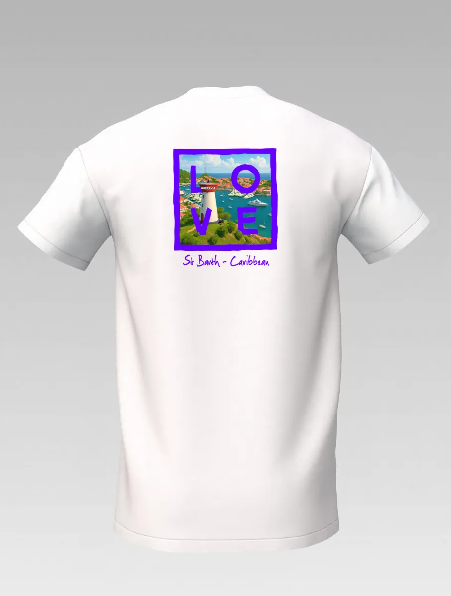 This white T-shirt from St Barth Signature, part of the LOVE Edition, celebrates the beauty of Gustavia Harbor, where boats rest on crystal-clear waters and colorful houses light up the horizon.