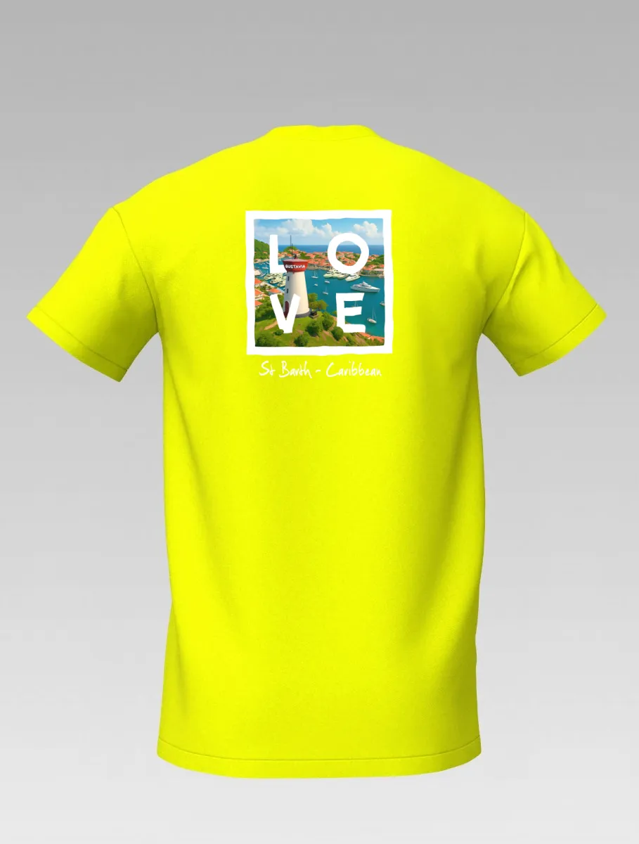 This yellow T-shirt from St Barth Signature, part of the LOVE Edition, celebrates the beauty of Gustavia Harbor, where boats rest on turquoise waters and colorful houses light up the horizon.