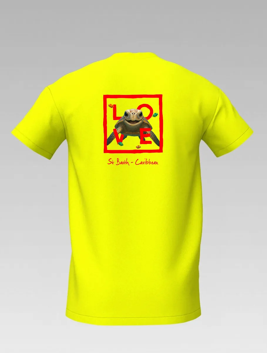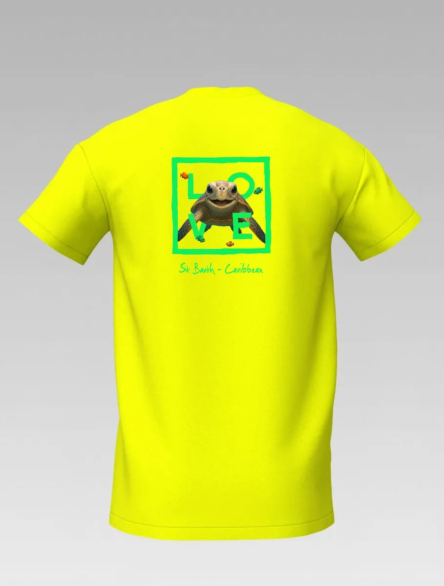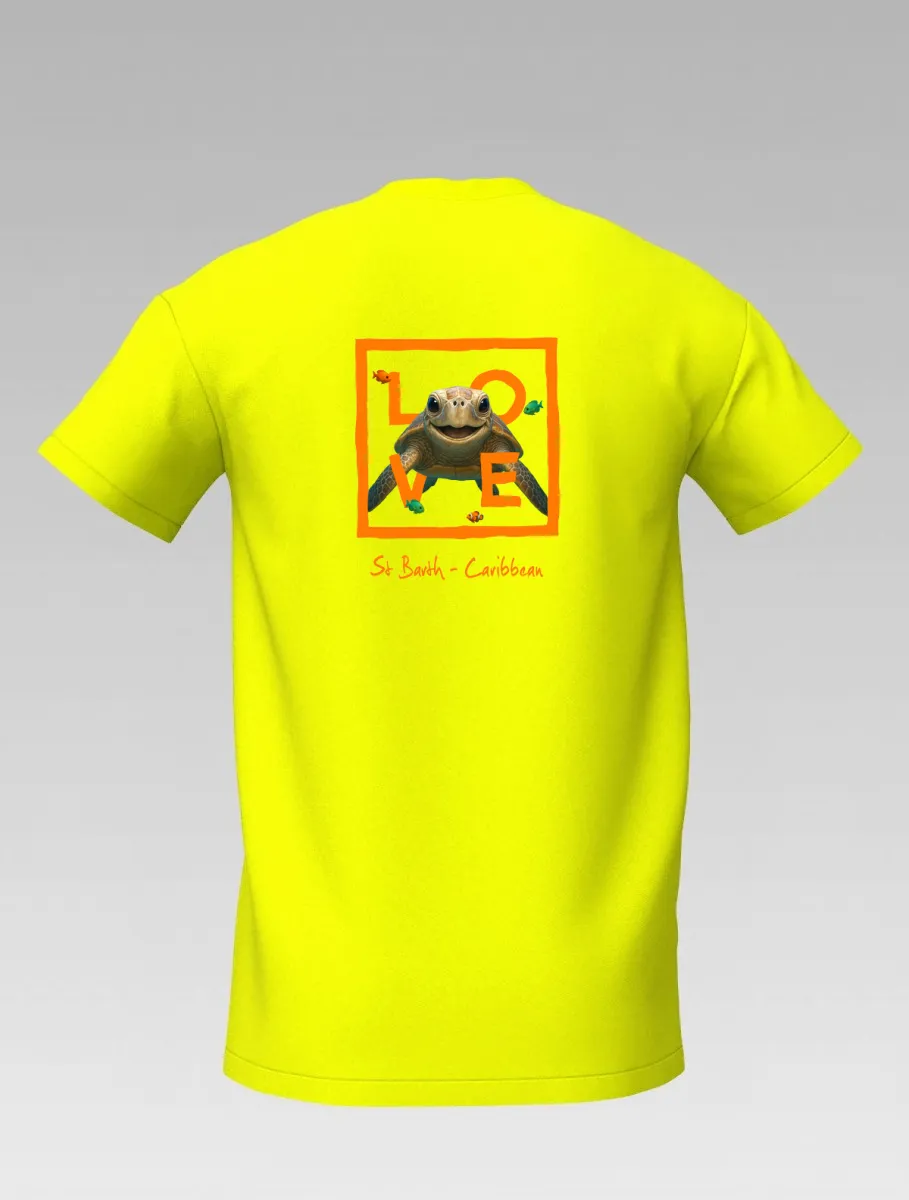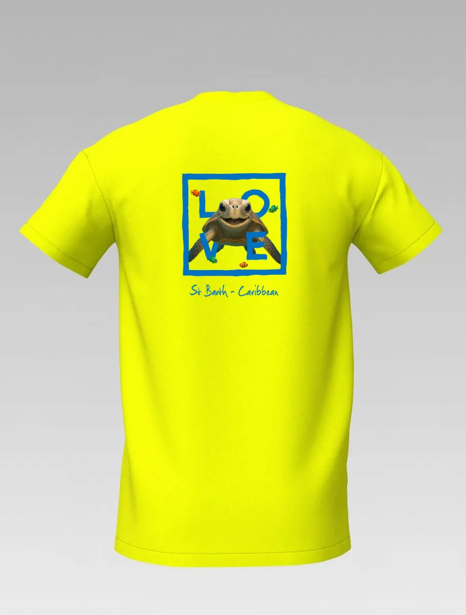 This yellow T-shirt from St Barth, part of the LOVE line, captures the sweetness and serenity of the ocean through a cheerful turtle swimming among corals and tropical colors.