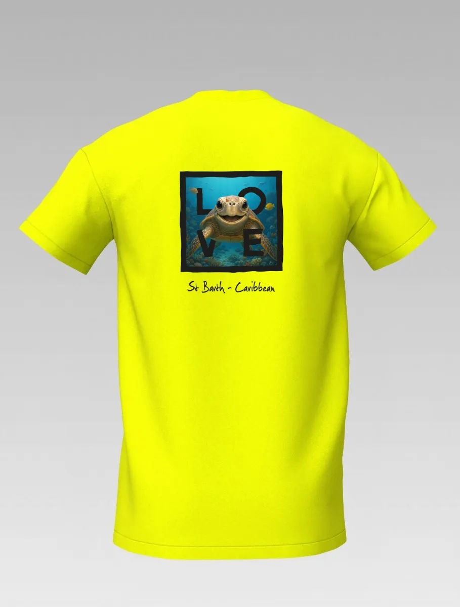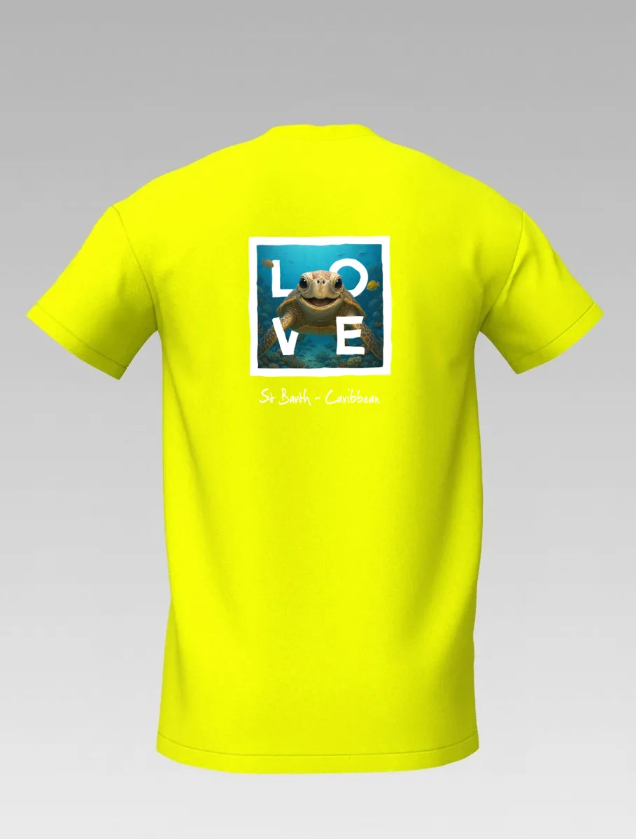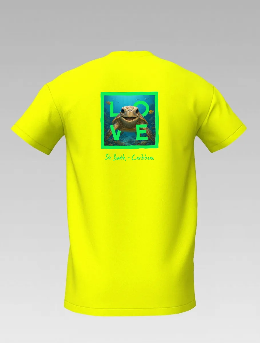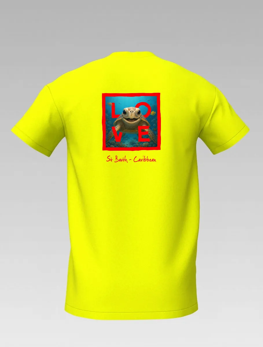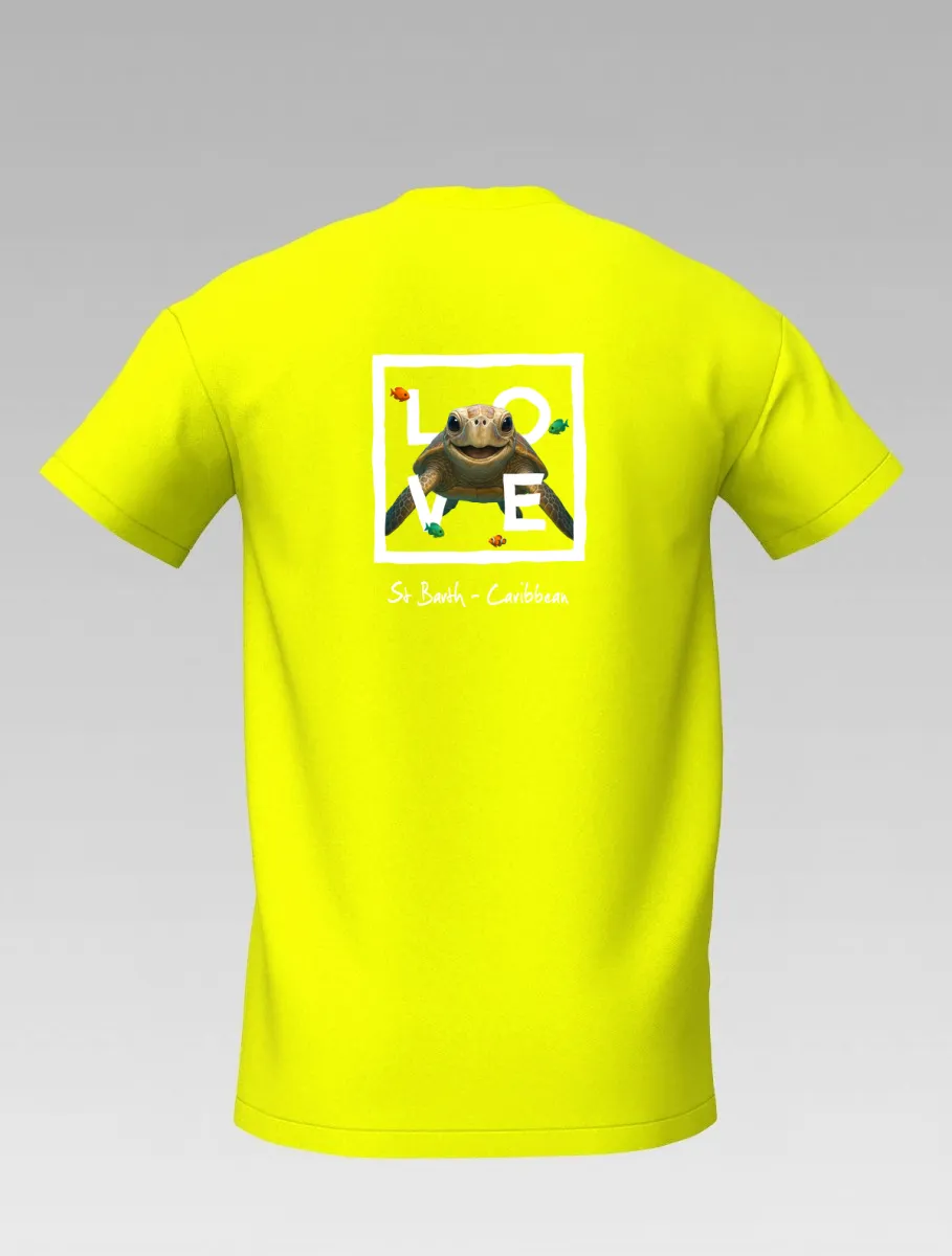 This yellow T-shirt from St Barth, part of the LOVE line, captures the sweetness and serenity of the ocean through a cheerful turtle swimming among corals and tropical colors.