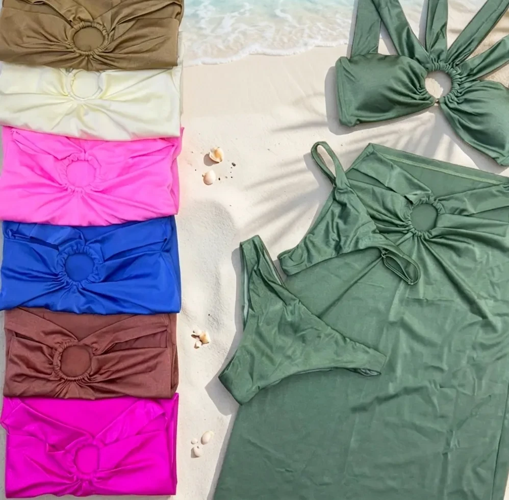 The Jewelry Ring Top: The centerpiece of the set. A sophisticated design where four delicate straps intertwine inside a decorative ring, creating a graphic and sensual effect on the neckline.
