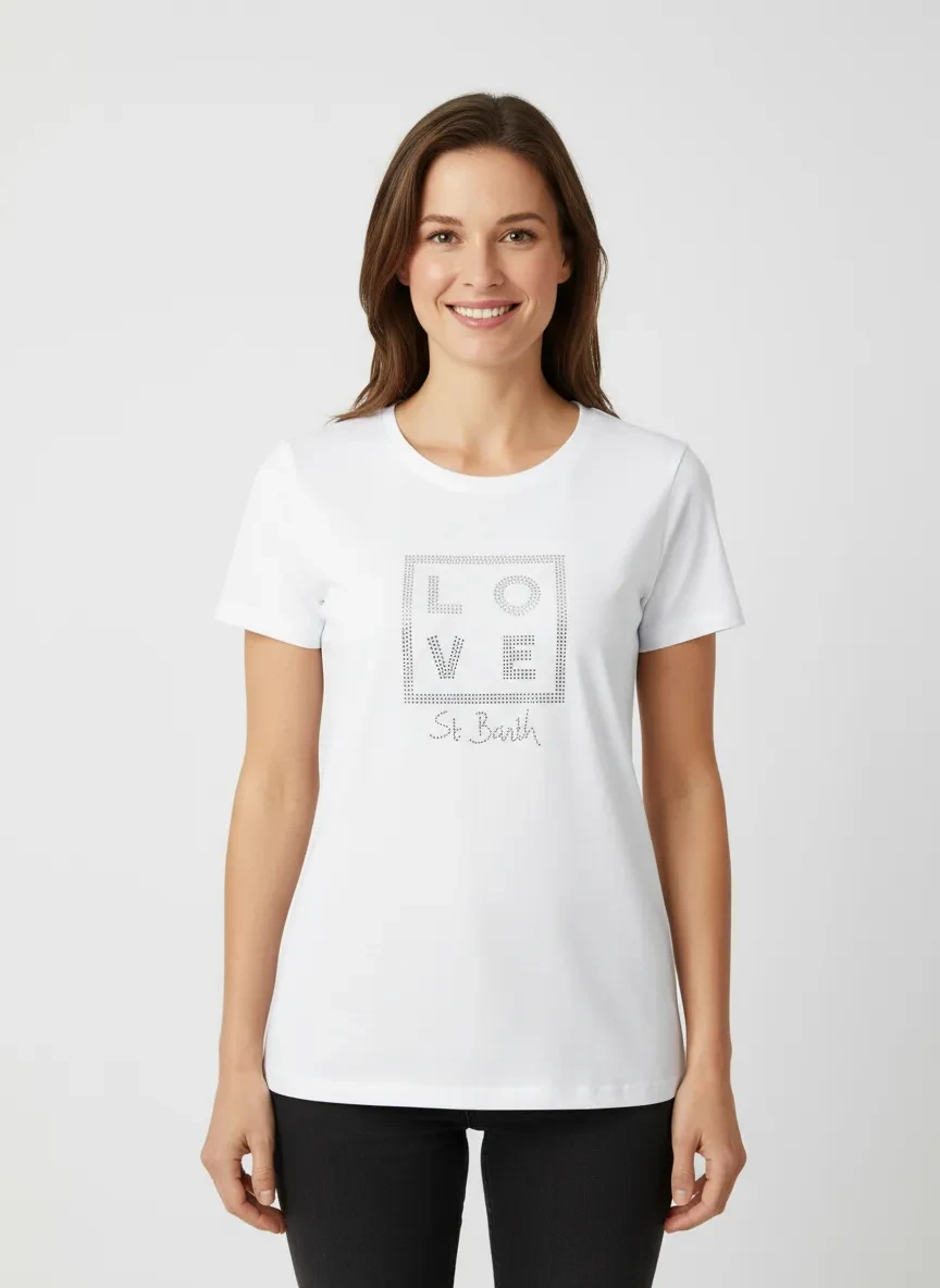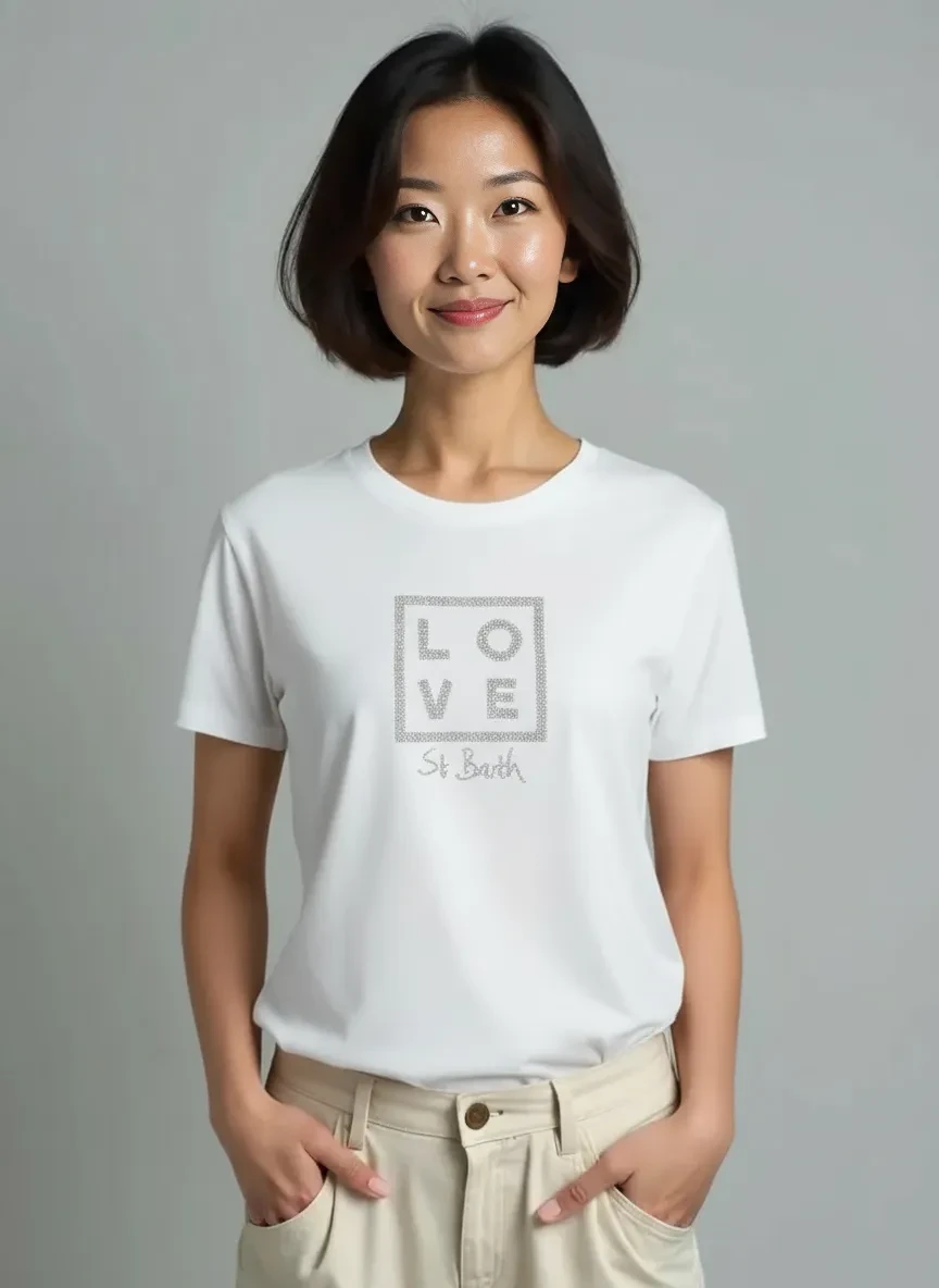 Discover the latest gem from the LOVE collection: a unique T-shirt for women and girls, featuring the iconic LOVE logo entirely embellished with shimmering strass.