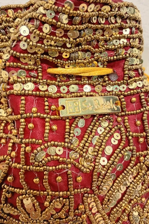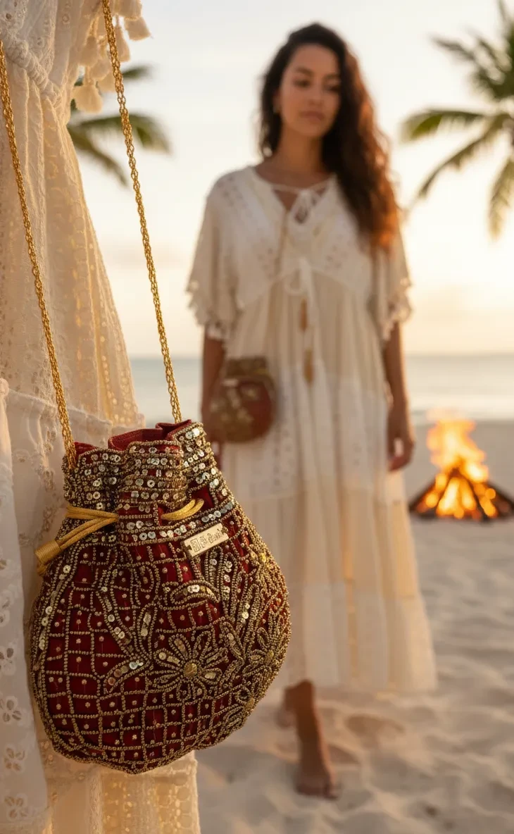 An exclusive evening accessory with a boho-chic flair, the golden sequin pouch bag is perfect for those seeking a unique and elegant touch. Its golden embroidery, delicate pearls, and shimmering details make it a standout piece that adds both personality and sophistication to your event outfit.