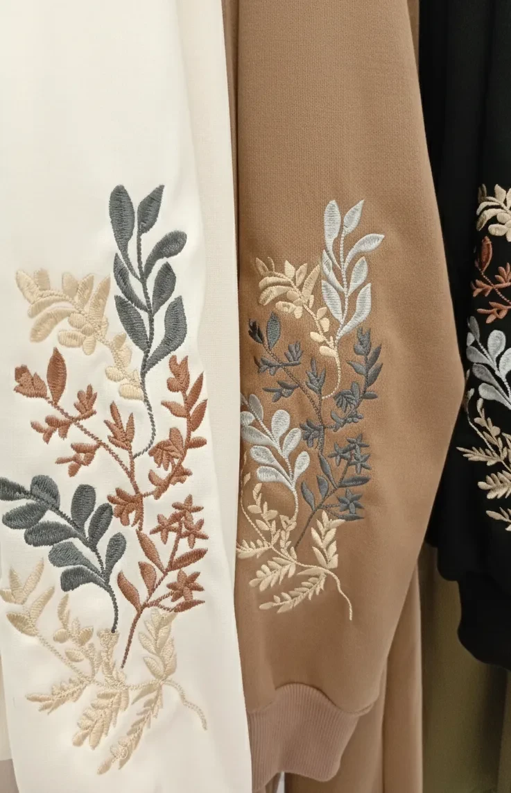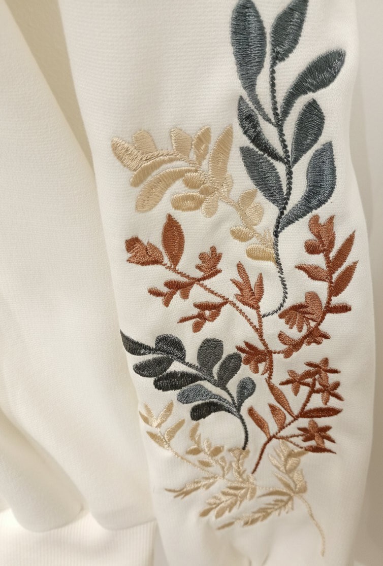 • Details on the front and sleeves: Embroidery in the shape of tropical leaves and palm fronds, in three shades: gold, beige, and silver – adding a touch of luxury and craftsmanship.