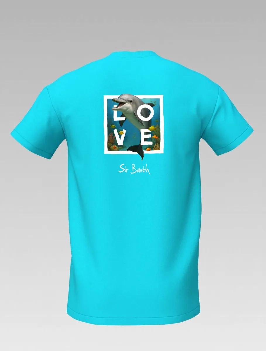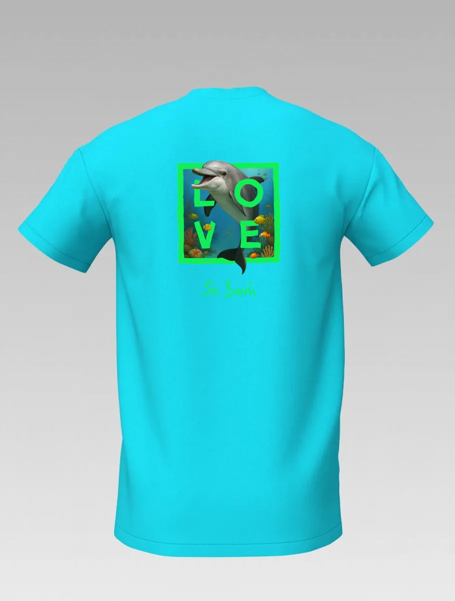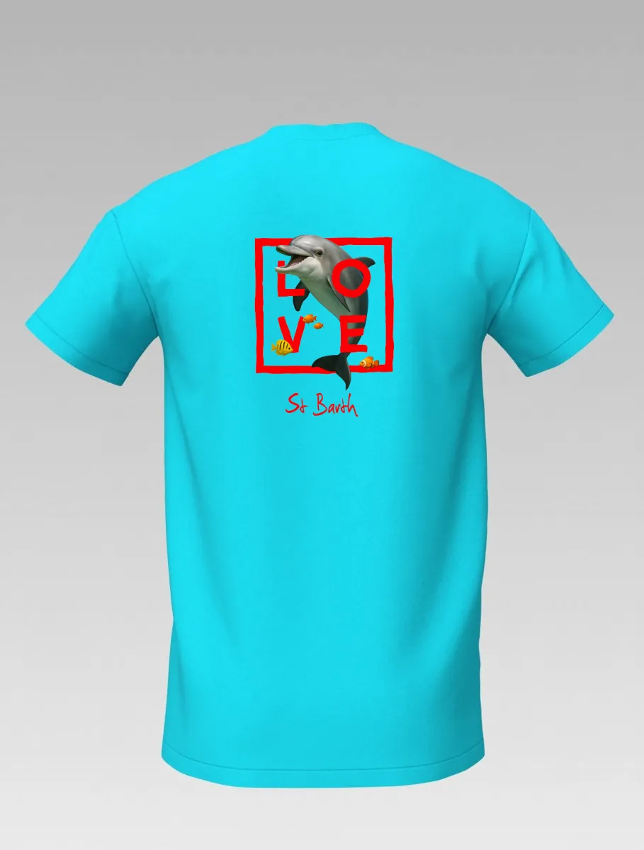 This turquoise T-shirt from St Barth, part of the LOVE line, celebrates the tenderness and energy of the ocean through the dolphin — a symbol of friendship, joy, and freedom.