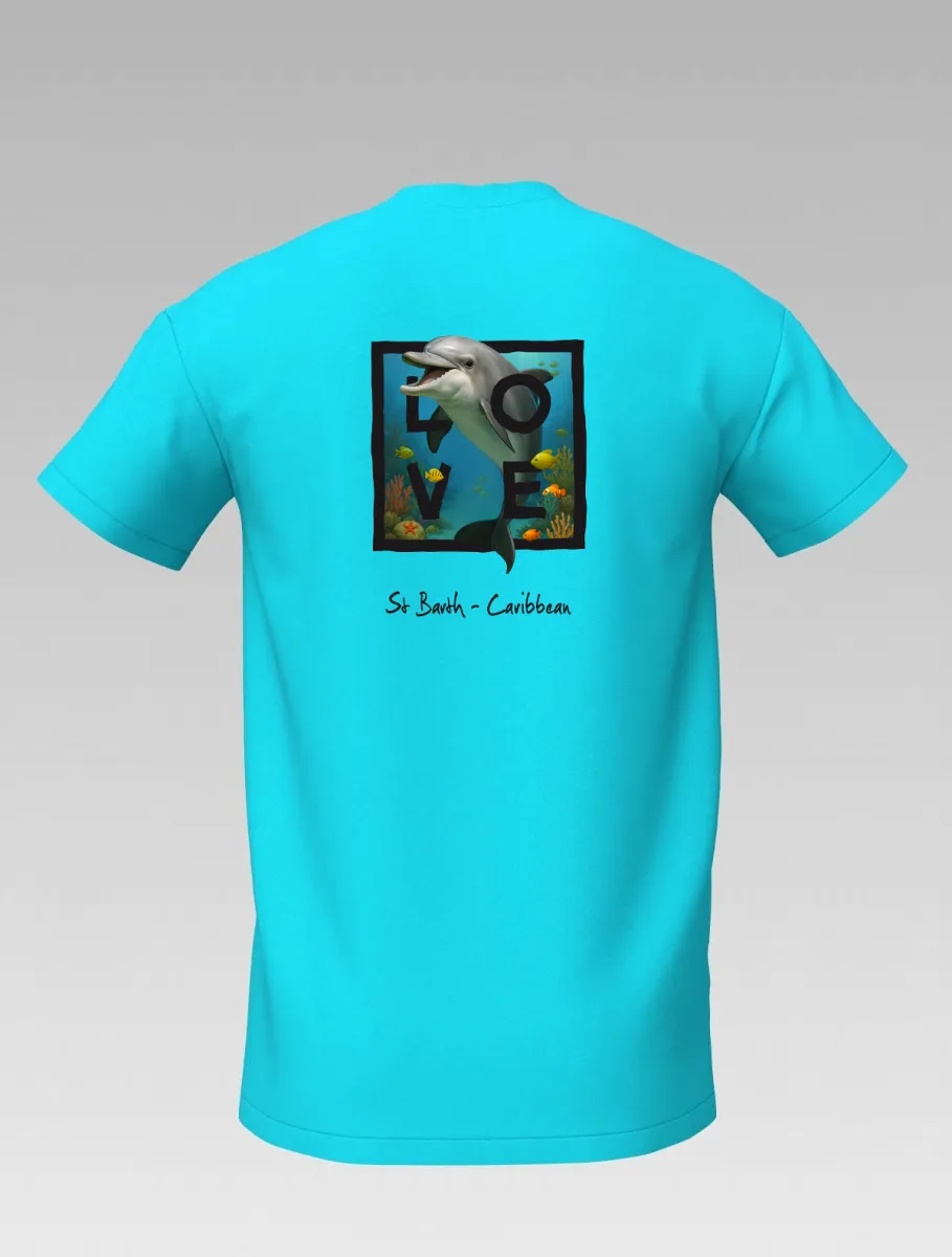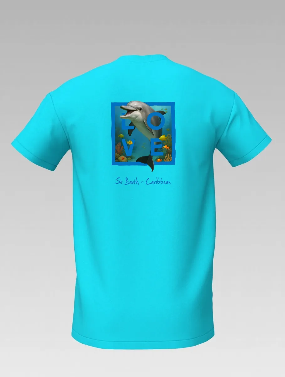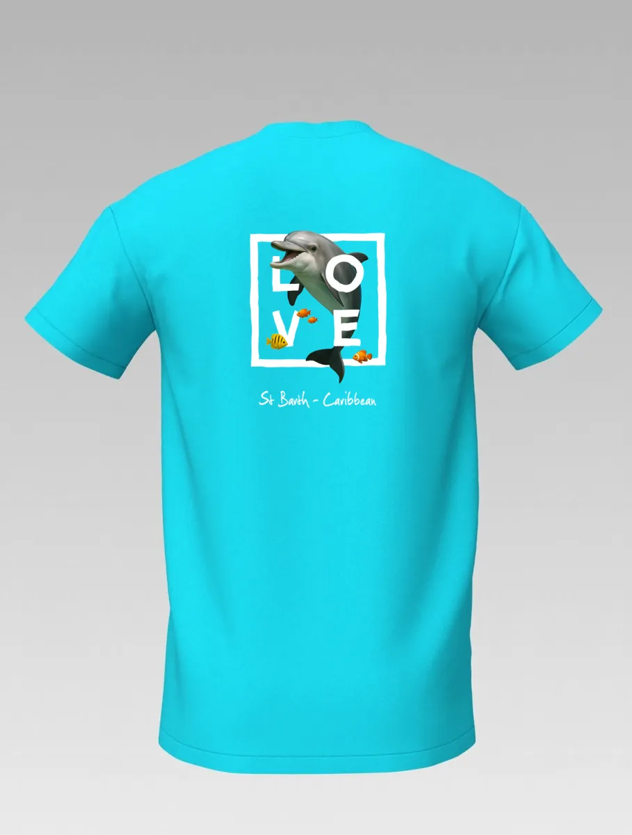 This turquoise T-shirt from St Barth, part of the LOVE line, celebrates the tenderness and energy of the ocean through the dolphin — a symbol of friendship, joy, and freedom.