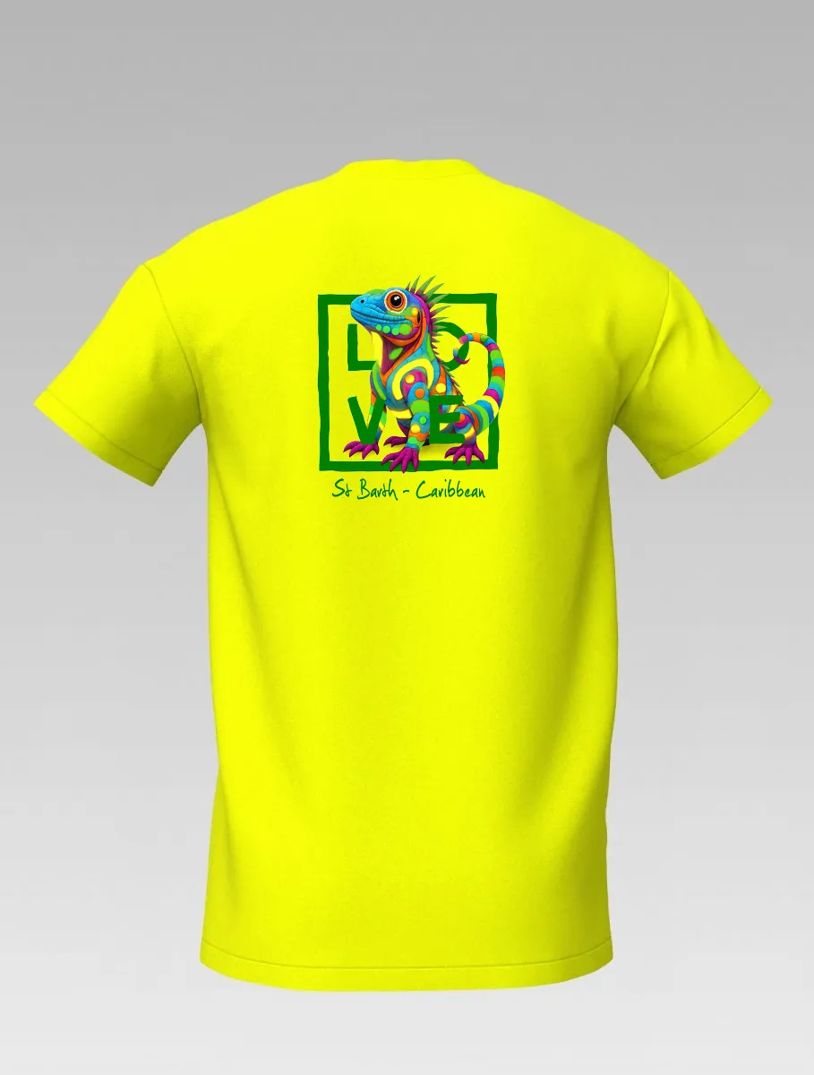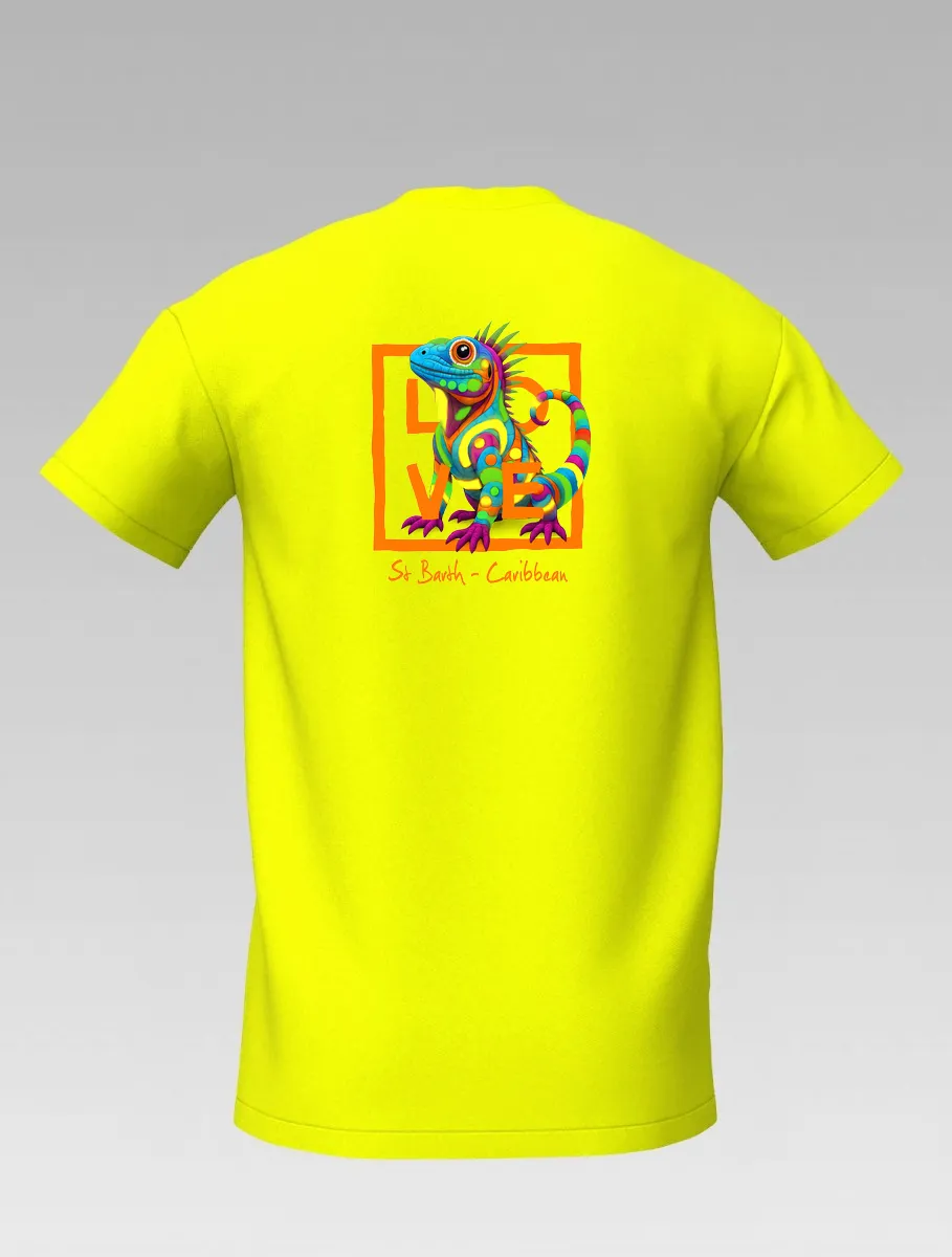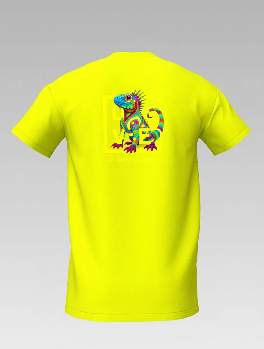 The illustration features a colorful and cheerful iguana, surrounded by tropical tones that evoke the free spirit of the Caribbean.