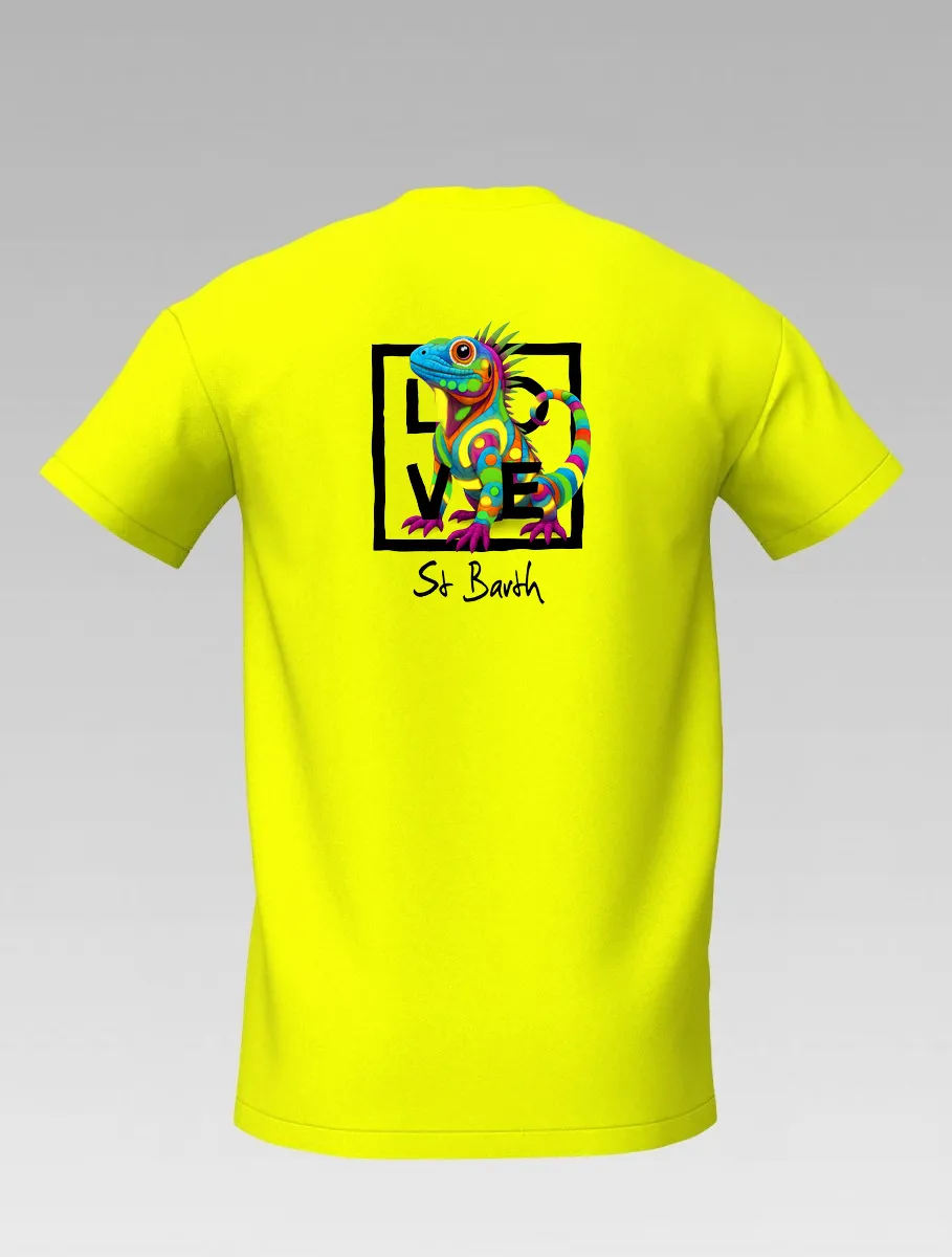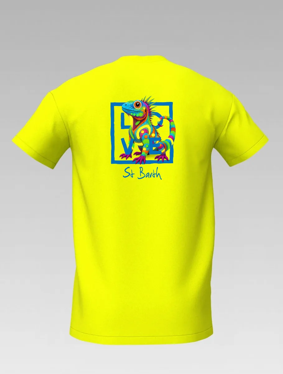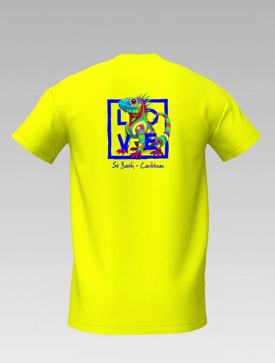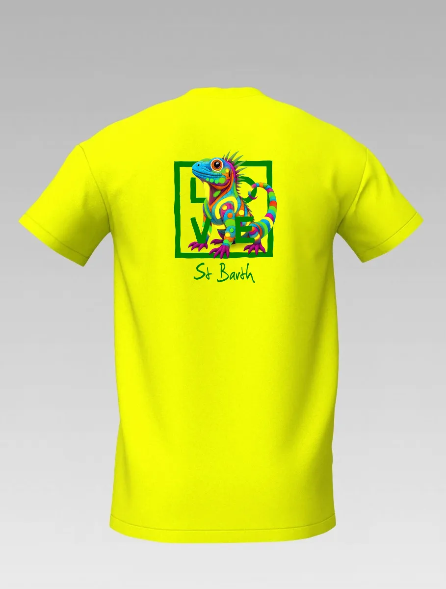 The illustration features a colorful and cheerful iguana, surrounded by tropical tones that evoke the free spirit of the Caribbean.